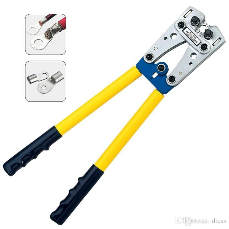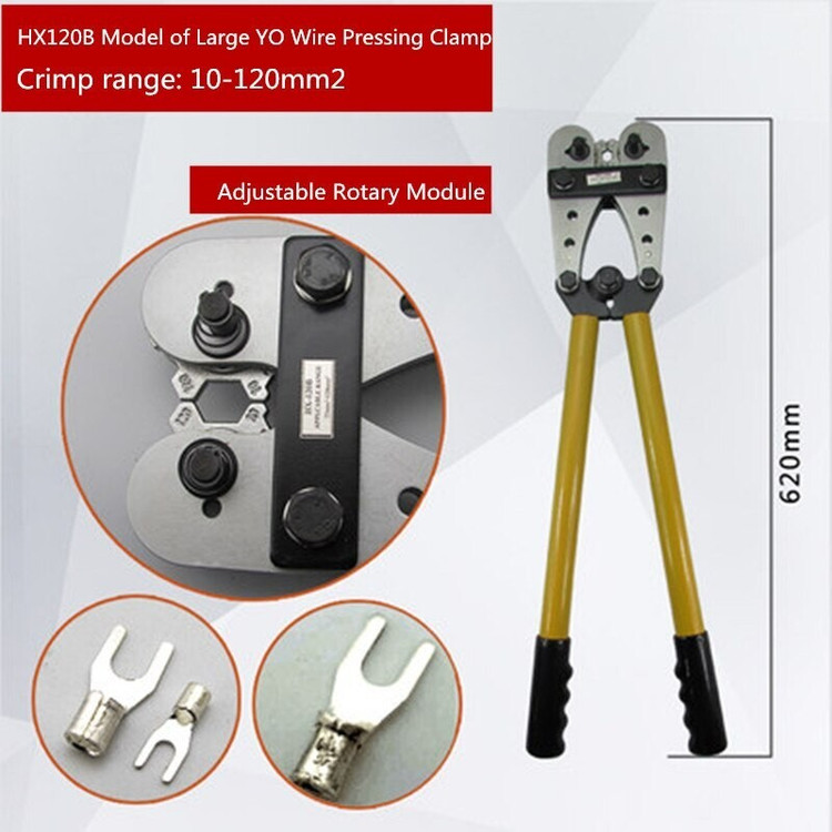 ابزار پرس دستی کابلشو HX-120B جهت نصب اتصالات کابلشو /رابط مسی از سایز (سطح مقطع) 10 الی 120 میلیمتر مربع به کابل مورد استفاده قرار می گیرد. نیروی پرس در ابزار پرس دستی کابلشو از طریق نیروی دست اپراتور تأمین می گردد. این ابزار حاوی 8 جفت قالب می باشد که همگی در قسمت سر ابزار، و به صورت یک تکه از جنس فولاد که حول محوری می چرخد تعبیه شد است. جهت استفاده از قالب با سایز مناسب، با فشار بر روی فنری که بر روی سر ابزار تعیبه شده قالب ها آزاد شده، سپس با چرخاندن محور قالب ها، قالب با سایز مناسب انتخاب می گردد. ضروری است هنگام پرس، دو سایز قالب انتخاب شده در هر دو قسمت ابزار یکی باشد، لذا انتخاب قالب با سایز مناسب باید به صورت مجزا جهت هر طرف صورت گیرد.