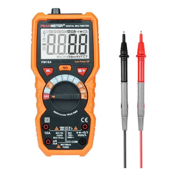 مولتی متر دیجیتال پیک متر مدل PM18A یک مولتی متر دیجیتال چند کاره می باشد که قادر به اندازه گیری ولتاژ AC/DC، جریان، مقاومت، ظرفیت، فرکانس و ... می باشد. این مولتی متر دیجیتال مدل PM18A تجهیز شده توسط یک ترموکوپل و قلم تست مناسب است. مولتی متر پرتابل با کیفیت پیک متر قادر به انجام تست NVC (ولتاژ القایی)، تست دیود، ترانزیستور و مداومت می باشد. از ویژگی های منحصر ب فرد این محصول می توان به دارا بودن عملکرد تشخیص و ردیابی ولتاژ به صورت غیر تماسی (القائی) برای اجتناب از شوک الکتریکی می باشد. عملکرد تست NVC این محصول دارای یک آلارم شنیداری می باشد همچنین دارای عملکرد گسترده به دلیل دارا بودن قابلیت اندازه گیری چندین کمیت الکتریکی نیز می باشد.