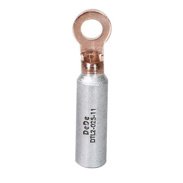 این نوع کابلشو ها جهت اتصال کابل آلومینیومی به شینه های مسی فشار ضعیف و یا بوشینگ انواع تجهیزات فشار متوسط (کلید ها، ترانسفورماتور ها، …) از طریق پیچ و مهره استفاده می شود. جهت استفاده از این نوع کابلشو بیمتال، کابل آلومینیومی داخل لوله ورودی کابلشو بیمتال شده و به بوسیله ابزار پرس مناسب با سایز دای مرتبط با سایز کابل، پرس می گردد. سپس سوراخ کابلشو در قسمت ورودی و رزوه دار شینه مسی یا بوشینگ قرار گرفته، و به واسطه پیچ و مهره محکم می گردد. لوله ورودی این کابلشو ها، آغشته به گریسی مخصوص با مقاومت دمایی بالا می باشد تا علاوه بر جلوگیری از اکسید شدن آلومینیوم، اتصال الکتریکی کابل به لوله ورودی کابلشو بیمتال را بهبود بخشد. لوله ورودی کابلشو توسط درپوش پلاستیکی مسدود شده است تا گریس به بیرون از لوله تراوش ننماید. تکنولوژی اتصال مس به آلومینیوم، “جوش اصطکاکی” می باشد. در کابلشو بیمتال های DeDe Electric Group ، قبل از سوراخ کاری قسمت آلومینیومی و فورج و پانج سر مسی، جوش اصطکاکی ایجاد می گردد و پس از آن مراحل سوراخ کاری، فورج، پانچ، … صورت می گیرد. با توجه به این فرآیند تولید، اتصال نا گسستنی مس به آلومینیوم کابلشوی تولید شده نهایی تضمین شده است، زیرا اتصالات سست در حین پروسه های پس از جوش اصطکاکی، خود به خود نمایان و از چرخه تولید حذف می گردند. این کابلشو ها در سایز های مختلف، جهت ورودی کابل آلومینیومی از سطح مقطع ۱۶ الی ۵۰۰ میلیمتر مربع عرضه می گردد. بر روی کابلشو ها، سایز کابل ورودی به کابلشو بیمتال بر حسب میلیمتر مربع، و قطر سوراخ کابلشو بر حسب سایز پیچ متریک در استاندارد ISO درج شده است.