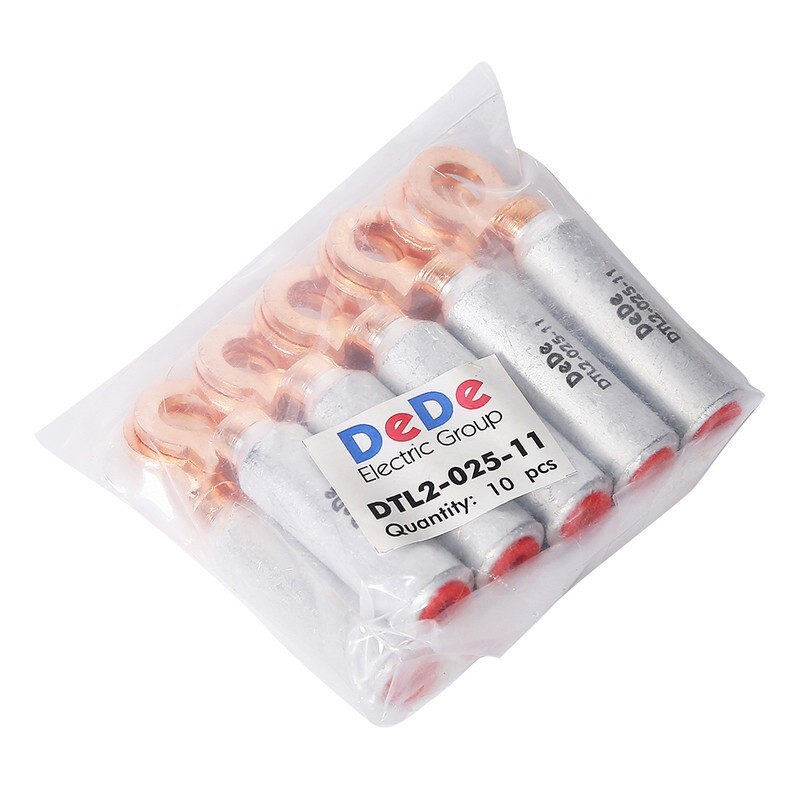 این نوع کابلشو ها جهت اتصال کابل آلومینیومی به شینه های مسی فشار ضعیف و یا بوشینگ انواع تجهیزات فشار متوسط (کلید ها، ترانسفورماتور ها، …) از طریق پیچ و مهره استفاده می شود. جهت استفاده از این نوع کابلشو بیمتال، کابل آلومینیومی داخل لوله ورودی کابلشو بیمتال شده و به بوسیله ابزار پرس مناسب با سایز دای مرتبط با سایز کابل، پرس می گردد. سپس سوراخ کابلشو در قسمت ورودی و رزوه دار شینه مسی یا بوشینگ قرار گرفته، و به واسطه پیچ و مهره محکم می گردد. لوله ورودی این کابلشو ها، آغشته به گریسی مخصوص با مقاومت دمایی بالا می باشد تا علاوه بر جلوگیری از اکسید شدن آلومینیوم، اتصال الکتریکی کابل به لوله ورودی کابلشو بیمتال را بهبود بخشد. لوله ورودی کابلشو توسط درپوش پلاستیکی مسدود شده است تا گریس به بیرون از لوله تراوش ننماید. تکنولوژی اتصال مس به آلومینیوم، “جوش اصطکاکی” می باشد. در کابلشو بیمتال های DeDe Electric Group ، قبل از سوراخ کاری قسمت آلومینیومی و فورج و پانج سر مسی، جوش اصطکاکی ایجاد می گردد و پس از آن مراحل سوراخ کاری، فورج، پانچ، … صورت می گیرد. با توجه به این فرآیند تولید، اتصال نا گسستنی مس به آلومینیوم کابلشوی تولید شده نهایی تضمین شده است، زیرا اتصالات سست در حین پروسه های پس از جوش اصطکاکی، خود به خود نمایان و از چرخه تولید حذف می گردند. این کابلشو ها در سایز های مختلف، جهت ورودی کابل آلومینیومی از سطح مقطع ۱۶ الی ۵۰۰ میلیمتر مربع عرضه می گردد. بر روی کابلشو ها، سایز کابل ورودی به کابلشو بیمتال بر حسب میلیمتر مربع، و قطر سوراخ کابلشو بر حسب سایز پیچ متریک در استاندارد ISO درج شده است.