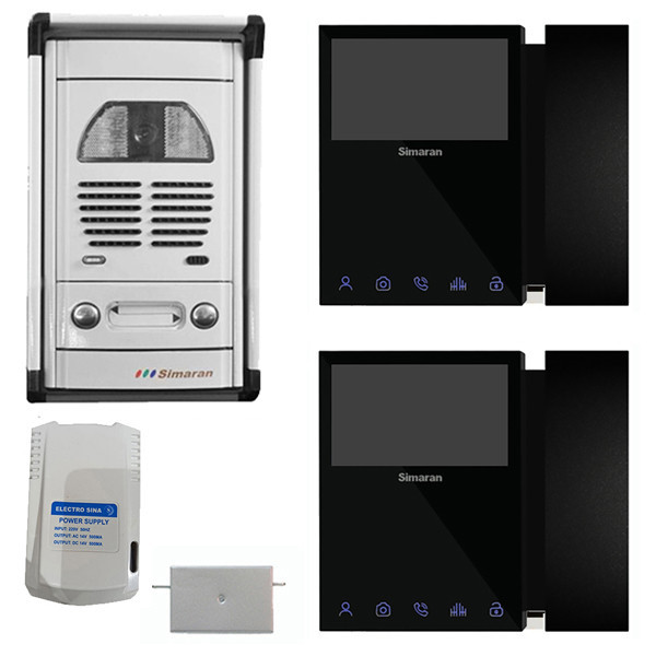 مجموعه 2 واحدی آیفون تصویری سیماران شامل مانیتور 4.3 اینچی فوق باریک سیماران مدل 46 بدون حافظه با دکمه های لمسی ، به همراه پنل 2 واحدی مدل فوژان و همراه با قفل و ترانس متناسب با دستگاه عرضه می شود. این محصول یکی از جدید ترین تولیدات شرکت سیماران است.