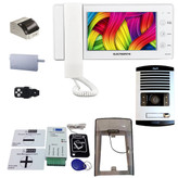 پکیج کامل دربازکن یک واحدی تصویری الکتروپیک این پکیج شامل پنل بیرونی مدل 1086 یک واحدی ، گوشی تصویری 7 اینچ سفید مدل 1294 ، منبع تغذیه مدل 386 می باشد. پنل 1086 الکتروپیک قابلیت دید در شب دارد و دارای سويیچ ضد سرقت می باشد و همچنین قابلیت تنظیم دوربین در چهار جهت در هنگام نصب را دارد ،نوارهای آب بندی دور پنل از نفوذ باران و گرد و غبار به داخل پنل جلوگیری میکند . گوشی تصویری ( مانیتور ) 7 اینچ مدل 1294 دارای دکمه های لمسی می باشد از ویژگی های این گوشی میتوان به قابلیت عکسبرداری و فیلمبرداری و اتصال کارت حافظه اشاره کرد البته این گوشی دارای حافظه داخلی میباشد اما درصورت نیاز به ضبط فیلم با صدای مراجعه کننده باید کارت حافظه داخل آن قرار گیرد .از دیگر امکانات این گوشی قابلیت اتصال به دو پنل بیرونی و دو دوربین امنیتی می باشد که بسیار پرکاربرد می باشد. بارانگیر شفاف LED دار پارس صنعت ماهان از کیفیت مطلوبی برخوردار است و از پنل دم دری در برابر نور خورشید، گردوخاک، باران، برف و تگرگ محافظت می کند.چراغ های LED تعبیه شده بر روی این بارانگیر باعث افزایش دید در شب دوربین پنل آیفون می گردد.جنس بدنه این محافظ پلی کربنات UV دار می باشد که در برابر رنگ پریدگی بسیار مقاوم است.ماژول درب بازکن کارتی ریموتی لگزو مدل DB201 :این ماژول دارای 2 عدد کارت مدیریت دستگاه است. کاربر توسط این دو کارت قادر خواهد بود تا کارت ها، تگ ها و ریموت های جدید را به دستگاه معرفی کند یا آنها را از حافظه دستگاه حذف نماید. به همراه آن 1 عدد کارت ، 1 عدد تگ جاسویچی و 1 عدد ریموت نیز قرار دارد که در صورت نیاز به تعداد بیشتر میتوانید هر کدام از آنها را به صورت جداگانه خریداری کنید و به دستگاه معرفی نمایید .همچنین اگر از قبل ریموت دارید و برای درب پارکینگ یا کرکره برقی استفاده می کنید، می توانید یکی از دکمه های بیکار ریموت را روی دستگاه ذخیره کنید و از این قابلیت دستگاه بهرمند شوید. این پکیج شامل پنل دم دری+گوشی تصویری+منبع تغذیه+قفل زنجیری+محافظ بارانگیر می باشد. این پکیج کامل می باشد و با خرید آن نیازی به خرید سایر اقلام نخواهید داشت.