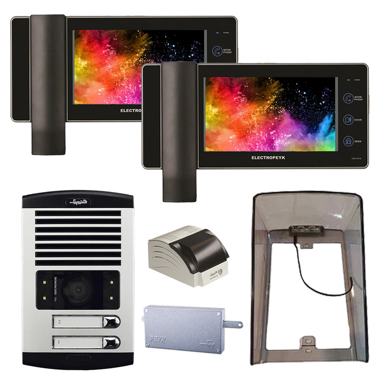 پکیج کامل دربازکن دو واحدی تصویری الکتروپیک این پکیج شامل پنل بیرونی مدل 1086 دو واحدی ، دو عدد گوشی تصویری 7 اینچ مشکی مدل 1294 ، منبع تغذیه مدل 386 ، قفل زنجیری مدل 671 و بارانگیر ال ای دی دار می باشد. پنل 1086 الکتروپیک قابلیت دید در شب دارد و دارای سويیچ ضد سرقت می باشد و همچنین قابلیت تنظیم دوربین در چهار جهت در هنگام نصب را دارد ،نوارهای آب بندی دور پنل از نفوذ باران و گرد و غبار به داخل پنل جلوگیری میکند . گوشی تصویری ( مانیتور ) 7 اینچ مدل 1294 دارای دکمه های لمسی می باشد از ویژگی های این گوشی میتوان به قابلیت عکسبرداری و فیلمبرداری و اتصال کارت حافظه اشاره کرد البته این گوشی دارای حافظه داخلی میباشد اما درصورت نیاز به ضبط فیلم با صدای مراجعه کننده باید کارت حافظه داخل آن قرار گیرد .از دیگر امکانات این گوشی قابلیت اتصال به دو پنل بیرونی و دو دوربین امنیتی می باشد که بسیار پرکاربرد می باشد.بارانگیر شفاف LED دار پارس صنعت ماهان از کیفیت مطلوبی برخوردار است و از پنل دم دری در برابر نور خورشید، گردوخاک، باران، برف و تگرگ محافظت می کند.چراغ های LED تعبیه شده بر روی این بارانگیر باعث افزایش دید در شب دوربین پنل آیفون می گردد.جنس بدنه این محافظ پلی کربنات UV دار می باشد که در برابر رنگ پریدگی بسیار مقاوم است. این پکیج شامل پنل دم دری+گوشی تصویری+منبع تغذیه+قفل زنجیری+محافظ بارانگیر می باشد. این پکیج کامل می باشد و با خرید آن نیازی به خرید سایر اقلام نخواهید داشت.