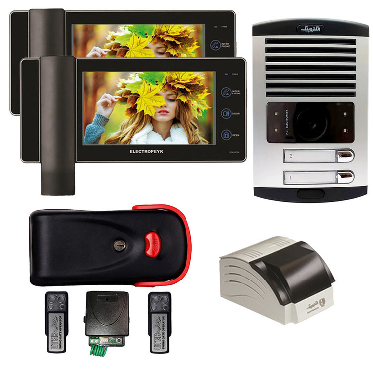 پکیج کامل دربازکن دو واحدی تصویری الکتروپیک این پکیج شامل پنل بیرونی مدل 1086 دو واحدی ، دو عدد گوشی تصویری 7 اینچ مدل 1294 ، قفل برقی یوتاب ریموتدار و منبع تغذیه مدل 386 می باشد. پنل 1086 الکتروپیک قابلیت دید در شب دارد و دارای سويیچ ضد سرقت می باشد و همچنین قابلیت تنظیم دوربین در چهار جهت در هنگام نصب را دارد ،نوارهای آب بندی دور پنل از نفوذ باران و گرد و غبار به داخل پنل جلوگیری میکند . گوشی تصویری ( مانیتور ) 7 اینچ مدل 1294 دارای دکمه های لمسی می باشد از ویژگی های این گوشی میتوان به قابلیت عکسبرداری و فیلمبرداری و اتصال کارت حافظه اشاره کرد البته این گوشی دارای حافظه داخلی میباشد اما درصورت نیاز به ضبط فیلم با صدای مراجعه کننده باید کارت حافظه داخل آن قرار گیرد .از دیگر امکانات این گوشی قابلیت اتصال به دو پنل بیرونی و دو دوربین امنیتی می باشد که بسیار پرکاربرد می باشد. قفل برقی ریموتدار یوتاب که تولید شده توسط شرکت یوتاب ( از زیر مجموعه های شرکت الکتروپیک ) می باشد. یکی از با کیفیت ترین محصولات قفل برقی تولید داخل است که با مقاومت و امنیت بسیار بالا به همراه ریموت کنترل جهت استفاده بر روی درب های حیاط منازل و مجتمع های مسکونی و تجاری و درب پارکینگ مورد استفاده قرار میگیرد . وزن هر قفل ریموتی یوتاب حدود 3 کیلوگرم است و ابعاد آن 11x9x20 سانتی متری میباشد جنس بدنه قفل از فولاد ضد زنگ و بدلیل استفاده از ورق گالوانیزه از مقاوت بسیار بالایی برخوردار است ، رنگ این قفل مشکی رنگ است که شاسی قرمز رنگ برای بازکردن درب به صورت دستی برای آن تعبیه شده است. قفل ریموت دار یوتاب دارای 5 عدد کلید و 2 عدد ریموت الکتروپیک بهمراه یک رسیور تک کانال عرضه میگردد.امکان اضافه نمودن ریموت در این رسیور وجود دارد و میتوان آن را به تعداد زیاد تکثیر کرد امکان تعویض مغزی قفل داخلی و بیرونی ، قابلیت نصب و راه اندازی به صورت عمودی یا افقی عدم باز شدن قفل در اثر لرزش زیاد و حتی ضربه از دیگر ویژگی های این قفل می باشد .قابلیت تنظیم مغزی قفل بیرونی 50 تا 80 میلیمتر را نیز دارد.پنل بیرونی ،گوشی های تصویری و منبع تغذیه دارای 3 سال گارنتی و قفل برقی یوتاب دارای 2 سال گارانتی شرکتی می باشد .این پکیج کامل بوده و با خرید آن نیازی به خرید سایر اقلام نخواهید داشت.