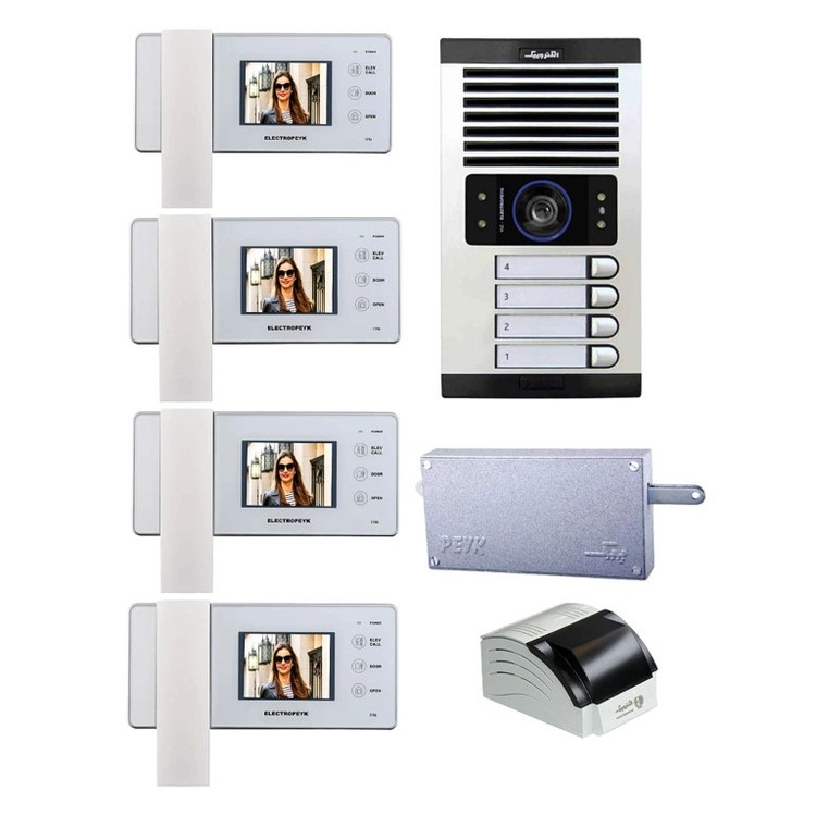 مجموعه دربازکن الکتروپیک مدل FD/1086/4/1196x4-white.شامل : پنل دم دری 1086 با قابلیت دید در شب و مجهز به چراغ LED میباشد . جنس بدنه این پنل آلومینیوم میباشد و دارای سوییچ ضد سرقت است.گوشی تصویری مدل 1196 الکتروپیک دارای نمایشگر 3/5 اینچ. دارای کلیدهای لمسی . حافظه داخلی و پشتیبانی از میکرو اس دی . قابلیت اتصال به یک دوربین دیگر . قابلیت اتصال به پنل دوم . تنظیم صدای زنگ و 10 ملودی متفاوت .همچنین این پکیج دارای منبع تغذیه مدل 386 به همراه قفل زنجیری میباشد .شرکت الکتروپیک یکی از شناخته شده ترین برند های تولیدکننده آیفون تصویری است که با طراحی و تولید انواع درب بازکن تصویری ساده، لوکس و کاربر پسند توانسته بین رقبای خارجی و ایرانی خود جایگاه خوب و مطمئنی را برای خود داشته، و از آن استفاده تمام کمالی را برده، و باعث این امر شده که این کمپانی ها سال ها به تولید آیفون تصویری رنگی با مدل ها و رنگ های مختلف بپردازد.این پکیج کامل بوده و با خرید این مجموعه دیگر نیازی به خرید سایر اقلام نخواهید داشت.