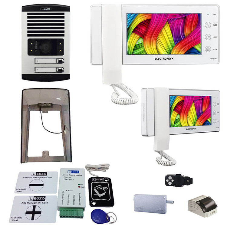 پکیج کامل دربازکن دو واحدی تصویری الکتروپیک این پکیج شامل پنل بیرونی مدل 1086 یک واحدی ، گوشی تصویری 7 اینچ سفید مدل 1294 ، منبع تغذیه مدل 386 می باشد. پنل 1086 الکتروپیک قابلیت دید در شب دارد و دارای سويیچ ضد سرقت می باشد و همچنین قابلیت تنظیم دوربین در چهار جهت در هنگام نصب را دارد ،نوارهای آب بندی دور پنل از نفوذ باران و گرد و غبار به داخل پنل جلوگیری میکند . گوشی تصویری ( مانیتور ) 7 اینچ مدل 1294 دارای دکمه های لمسی می باشد از ویژگی های این گوشی میتوان به قابلیت عکسبرداری و فیلمبرداری و اتصال کارت حافظه اشاره کرد البته این گوشی دارای حافظه داخلی میباشد اما درصورت نیاز به ضبط فیلم با صدای مراجعه کننده باید کارت حافظه داخل آن قرار گیرد .از دیگر امکانات این گوشی قابلیت اتصال به دو پنل بیرونی و دو دوربین امنیتی می باشد که بسیار پرکاربرد می باشد. بارانگیر شفاف LED دار پارس صنعت ماهان از کیفیت مطلوبی برخوردار است و از پنل دم دری در برابر نور خورشید، گردوخاک، باران، برف و تگرگ محافظت می کند.چراغ های LED تعبیه شده بر روی این بارانگیر باعث افزایش دید در شب دوربین پنل آیفون می گردد.جنس بدنه این محافظ پلی کربنات UV دار می باشد که در برابر رنگ پریدگی بسیار مقاوم است.ماژول درب بازکن کارتی ریموتی لگزو مدل DB201 :این ماژول دارای 2 عدد کارت مدیریت دستگاه است. کاربر توسط این دو کارت قادر خواهد بود تا کارت ها، تگ ها و ریموت های جدید را به دستگاه معرفی کند یا آنها را از حافظه دستگاه حذف نماید. به همراه آن 1 عدد کارت ، 1 عدد تگ جاسویچی و 1 عدد ریموت نیز قرار دارد که در صورت نیاز به تعداد بیشتر میتوانید هر کدام از آنها را به صورت جداگانه خریداری کنید و به دستگاه معرفی نمایید .همچنین اگر از قبل ریموت دارید و برای درب پارکینگ یا کرکره برقی استفاده می کنید، می توانید یکی از دکمه های بیکار ریموت را روی دستگاه ذخیره کنید و از این قابلیت دستگاه بهرمند شوید. این پکیج شامل پنل دم دری+گوشی تصویری+منبع تغذیه+قفل زنجیری+محافظ بارانگیر می باشد. این پکیج کامل می باشد و با خرید آن نیازی به خرید سایر اقلام نخواهید داشت.