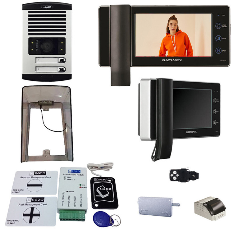 پکیج کامل دربازکن دو واحدی تصویری الکتروپیک این پکیج شامل پنل بیرونی مدل 1086 دو واحدی ، گوشی تصویری 7 اینچ سفید مدل 1294 ، منبع تغذیه مدل 386 می باشد. پنل 1086 الکتروپیک قابلیت دید در شب دارد و دارای سويیچ ضد سرقت می باشد و همچنین قابلیت تنظیم دوربین در چهار جهت در هنگام نصب را دارد ،نوارهای آب بندی دور پنل از نفوذ باران و گرد و غبار به داخل پنل جلوگیری میکند . گوشی تصویری ( مانیتور ) 7 اینچ مدل 1294 دارای دکمه های لمسی می باشد از ویژگی های این گوشی میتوان به قابلیت عکسبرداری و فیلمبرداری و اتصال کارت حافظه اشاره کرد البته این گوشی دارای حافظه داخلی میباشد اما درصورت نیاز به ضبط فیلم با صدای مراجعه کننده باید کارت حافظه داخل آن قرار گیرد .از دیگر امکانات این گوشی قابلیت اتصال به دو پنل بیرونی و دو دوربین امنیتی می باشد که بسیار پرکاربرد می باشد. بارانگیر شفاف LED دار پارس صنعت ماهان از کیفیت مطلوبی برخوردار است و از پنل دم دری در برابر نور خورشید، گردوخاک، باران، برف و تگرگ محافظت می کند.چراغ های LED تعبیه شده بر روی این بارانگیر باعث افزایش دید در شب دوربین پنل آیفون می گردد.جنس بدنه این محافظ پلی کربنات UV دار می باشد که در برابر رنگ پریدگی بسیار مقاوم است.ماژول درب بازکن کارتی ریموتی لگزو مدل DB201 :این ماژول دارای 2 عدد کارت مدیریت دستگاه است. کاربر توسط این دو کارت قادر خواهد بود تا کارت ها، تگ ها و ریموت های جدید را به دستگاه معرفی کند یا آنها را از حافظه دستگاه حذف نماید. به همراه آن 1 عدد کارت ، 1 عدد تگ جاسویچی و 1 عدد ریموت نیز قرار دارد که در صورت نیاز به تعداد بیشتر میتوانید هر کدام از آنها را به صورت جداگانه خریداری کنید و به دستگاه معرفی نمایید .همچنین اگر از قبل ریموت دارید و برای درب پارکینگ یا کرکره برقی استفاده می کنید، می توانید یکی از دکمه های بیکار ریموت را روی دستگاه ذخیره کنید و از این قابلیت دستگاه بهرمند شوید. این پکیج شامل پنل دم دری+گوشی تصویری+منبع تغذیه+قفل زنجیری+محافظ بارانگیر می باشد. این پکیج کامل می باشد و با خرید آن نیازی به خرید سایر اقلام نخواهید داشت.