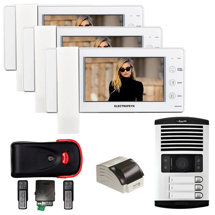 پکیج کامل دربازکن سه واحدی تصویری الکتروپیک این پکیج شامل پنل بیرونی مدل 1086 سه واحدی ،سه عدد گوشی تصویری 7 اینچ مدل1294 سفید ، قفل برقی یوتاب ریموتدار و منبع تغذیه مدل 386 می باشد. پنل 1086 الکتروپیک قابلیت دید در شب دارد و دارای سويیچ ضد سرقت می باشد و همچنین قابلیت تنظیم دوربین در چهار جهت در هنگام نصب را دارد ،نوارهای آب بندی دور پنل از نفوذ باران و گرد و غبار به داخل پنل جلوگیری میکند . گوشی های تصویری ( مانیتور ) 7 اینچ مدل 1294 دارای دکمه های لمسی می باشد از ویژگی های این گوشی میتوان به قابلیت عکسبرداری و فیلمبرداری و اتصال کارت حافظه اشاره کرد البته این گوشی دارای حافظه داخلی میباشد اما درصورت نیاز به ضبط فیلم با صدای مراجعه کننده باید کارت حافظه داخل آن قرار گیرد .از دیگر امکانات این گوشی قابلیت اتصال به دو پنل بیرونی و دو دوربین امنیتی می باشد که بسیار پرکاربرد می باشد. قفل برقی ریموتدار یوتاب که تولید شده توسط شرکت یوتاب ( از زیر مجموعه های شرکت الکتروپیک ) می باشد. یکی از با کیفیت ترین محصولات قفل برقی تولید داخل است که با مقاومت و امنیت بسیار بالا به همراه ریموت کنترل جهت استفاده بر روی درب های حیاط منازل و مجتمع های مسکونی و تجاری و درب پارکینگ مورد استفاده قرار میگیرد . وزن هر قفل ریموتی یوتاب حدود 3 کیلوگرم است و ابعاد آن 11x9x20 سانتی متری میباشد جنس بدنه قفل از فولاد ضد زنگ و بدلیل استفاده از ورق گالوانیزه از مقاوت بسیار بالایی برخوردار است ، رنگ این قفل مشکی رنگ است که شاسی قرمز رنگ برای بازکردن درب به صورت دستی برای آن تعبیه شده است. قفل ریموت دار یوتاب دارای 5 عدد کلید و 2 عدد ریموت الکتروپیک بهمراه یک رسیور تک کانال عرضه میگردد.امکان اضافه نمودن ریموت در این رسیور وجود دارد و میتوان آن را به تعداد زیاد تکثیر کرد امکان تعویض مغزی قفل داخلی و بیرونی ، قابلیت نصب و راه اندازی به صورت عمودی یا افقی عدم باز شدن قفل در اثر لرزش زیاد و حتی ضربه از دیگر ویژگی های این قفل می باشد .قابلیت تنظیم مغزی قفل بیرونی 50 تا 80 میلیمتر را نیز دارد.پنل بیرونی ،گوشی های تصویری و منبع تغذیه دارای و قفل برقی یوتاب می باشد .این پکیج کامل بوده و با خرید آن نیازی به خرید سایر اقلام نخواهید داشت.