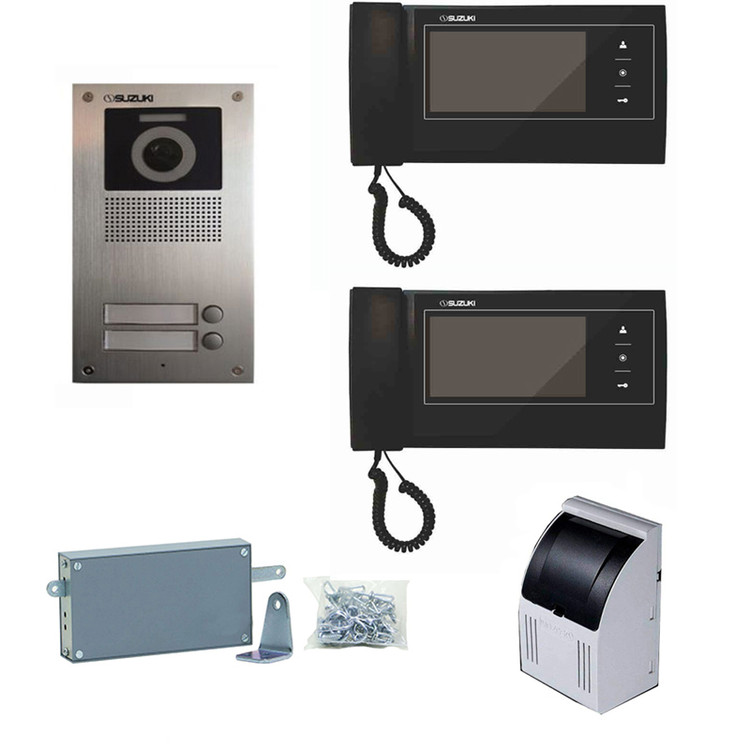 پکیج 2 طبقه کامل سوزوکی شامل یک عدد پنل تک واحدی سوزوکی ،2 عدد گوشی 727Mi با حافظه 7 اینچ دکمه لمسی به رنگ مشکی و یک عدد ترانس 12 ولت و قفل زنجیری می باشد. این پکیج اصطلاحا آماده نصب بوده و نیاز به هیچ وسیله دیگری ندارد. البته سیم کشی ها باید انجام شده باشد.