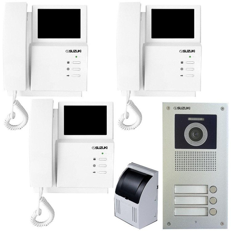 این پکیج شامل یک عدد پنل سه واحدی سوزوکی ،سه عدد گوشی 413Mi حافظه دار 4.3 اینچ و یک عدد ترانس 1A می باشد. این پکیج اصطلاحا آماده نصب بوده و نیاز به هیچ وسیله دیگری ندارد. البته سیم کشی ها باید انجام شده باشد و درب قفل داشته باشد.